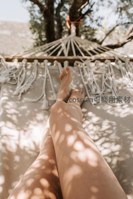 从第一人称视角看去,一双赤裸的双脚搭在米色的编织吊床上,阳光透过树叶在腿上投下斑驳的光影,远处是模糊的树木和山峦,传递出宁静舒适的度假感。
