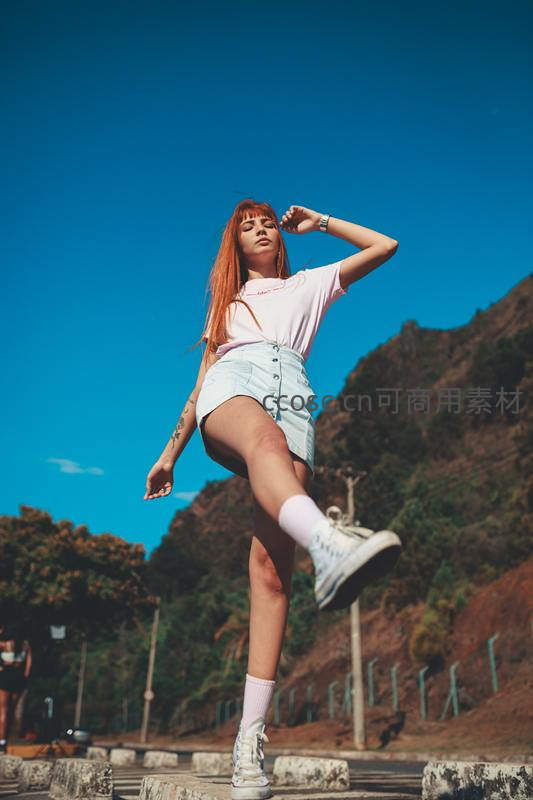 少女在晴朗蓝天与青山环绕的路边起舞,身着休闲装束,动作轻盈自信,展现自然与青春碰撞的动感瞬间。