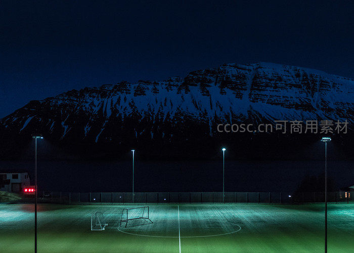 雪山下空旷的夜足球场