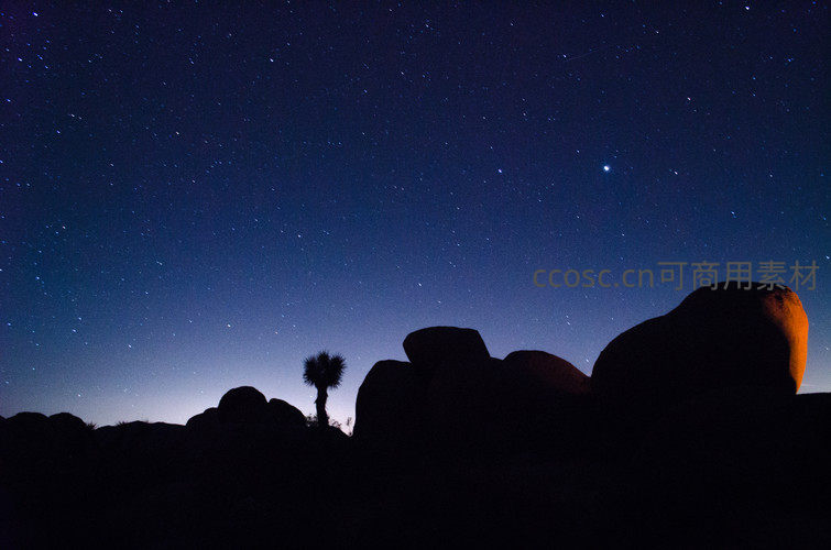 深蓝色的夜空中繁星如钻,下方是嶙峋的岩石和孤傲的约书亚树剪影,展现荒漠夜晚的原始、静谧与浩瀚宇宙之美。
