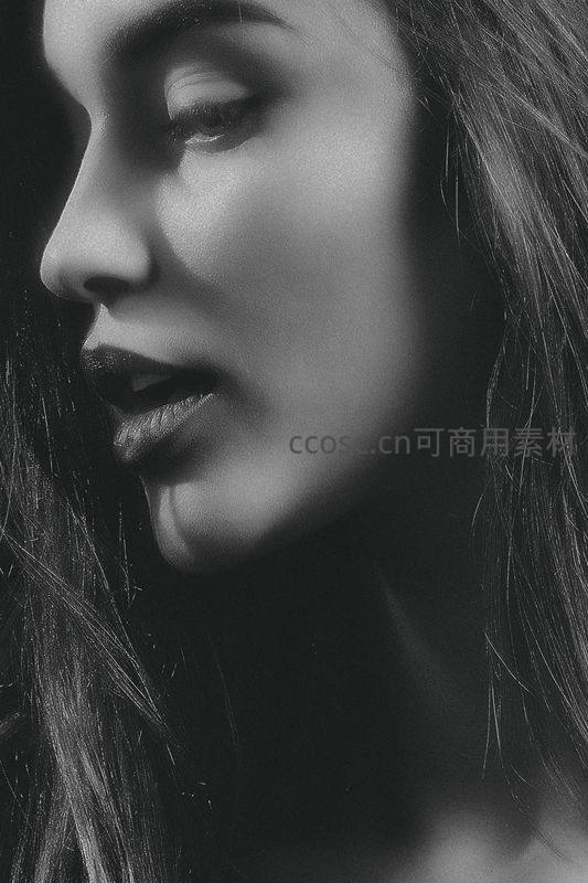 柔和的光线勾勒出女性完美的侧脸轮廓,微启的唇瓣与飘逸的发丝共同构成一幅宁静而富有诗意的画面,展现了光影与人体线条的极致美感。