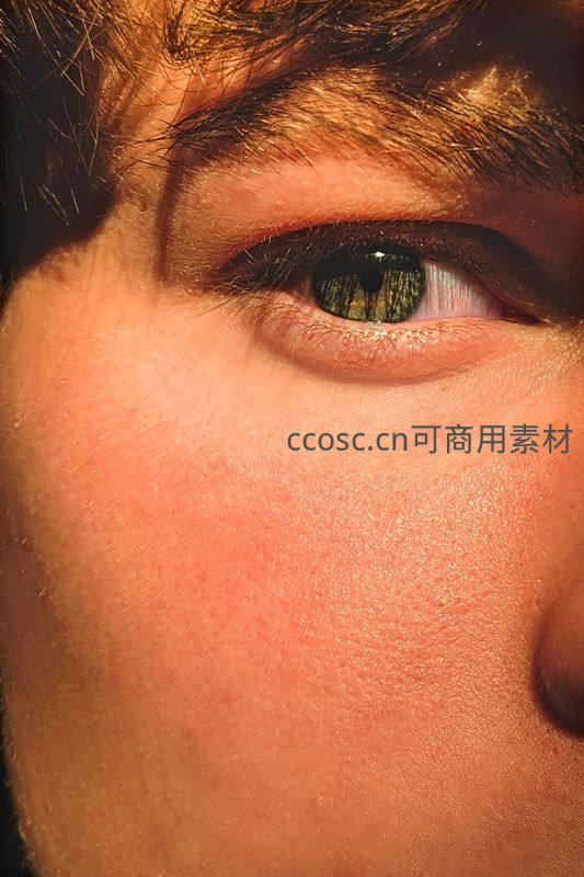 微距镜头捕捉人眼细节,绿色瞳孔在暖光中闪耀,皮肤纹理清晰可见,睫毛根根分明,传达细腻、温暖而富有生命力的视觉感受。