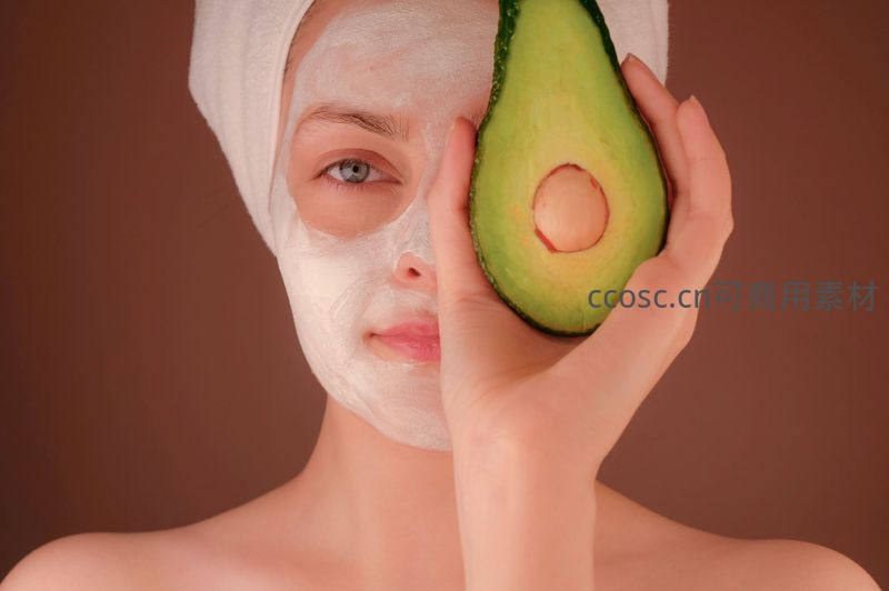 一位女士敷着白色面膜,用毛巾包裹头发,手持半个新鲜牛油果遮住一只眼睛,展现了崇尚天然成分的居家美容护理场景。