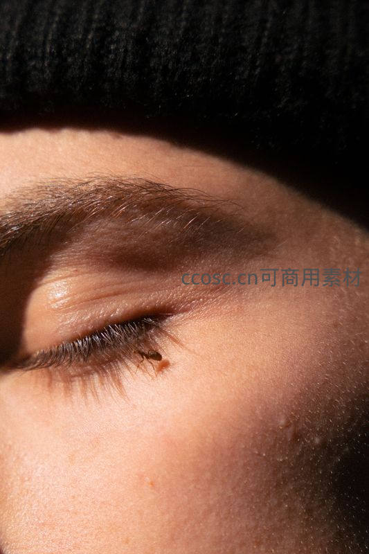 这张微距照片捕捉了闭合的眼睑、纤长的睫毛以及皮肤上细腻的毛孔和纹路,阳光从一侧洒下,突显了肌肤的自然质感与真实美感。