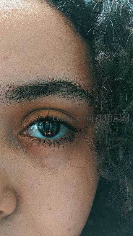 极致微距捕捉清澈蓝瞳中的世界倒影,浓密睫毛与自然眉形相衬,卷曲黑发温柔环绕,展现人物内心深处的宁静与力量。