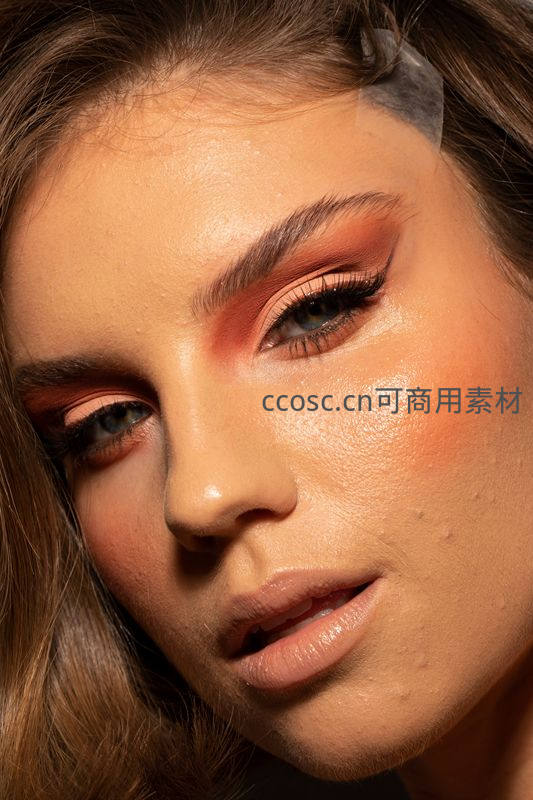 女性面部特写,展示精致的暖色调眼影和高光妆效,眼神专注而迷人,体现专业化妆技巧与时尚美感。