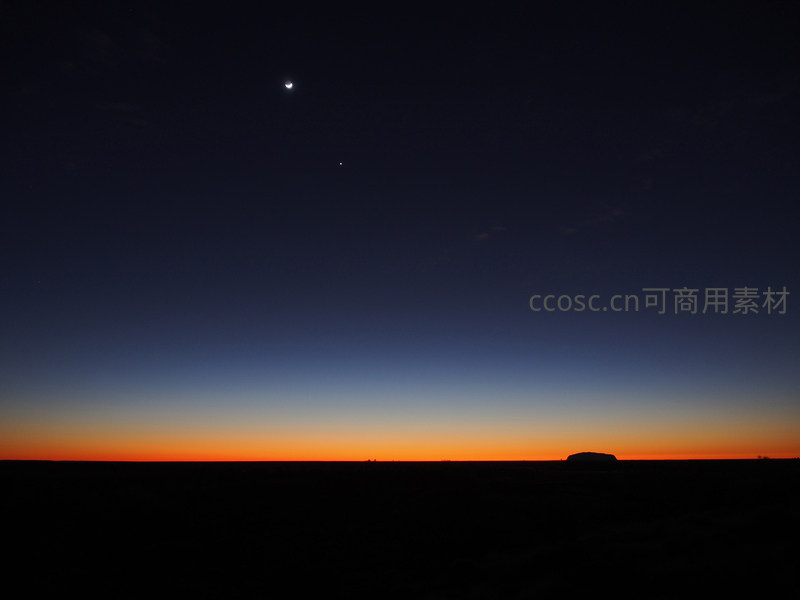 广袤平原的地平线上,一轮弯月与星辰悄然升起,天空由深蓝过渡到橙红,大地沉入无边的寂静与辽阔。