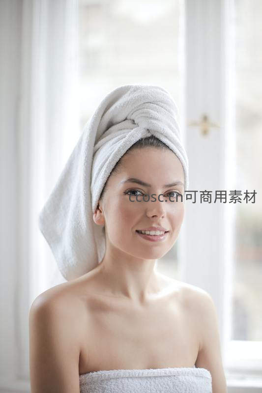 女子裹着白色浴巾,头戴毛巾,面带轻松微笑望向镜头,背景柔和窗光,传递出舒适惬意的生活瞬间。