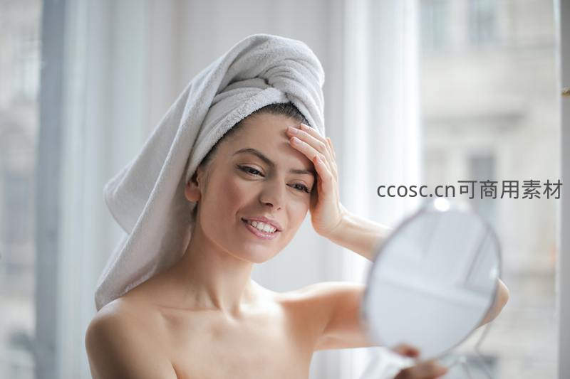 女子手持小圆镜检查皮肤状态,手抚额头,笑容自信愉悦,体现日常护肤中的自我关怀与生活仪式感。