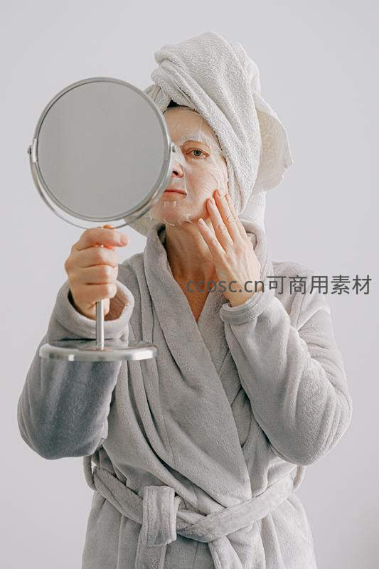 女士身穿浴袍,头戴毛巾,手持圆形化妆镜,正专注地将白色面膜均匀涂抹于面部,体现了日常精致护肤的仪式感。