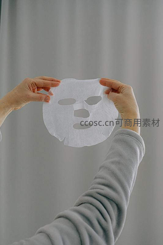 一双女性的手举着一张未使用的白色纸质面膜,背景为纯色窗帘,突出产品本身,传达即将开始的护肤程序的纯净与期待。