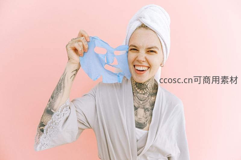 一位笑容灿烂的女士,头裹毛巾,身穿浴袍,高举一片蓝色面膜,背景为柔和的粉色,传递出使用护肤品时的愉悦和满足感。