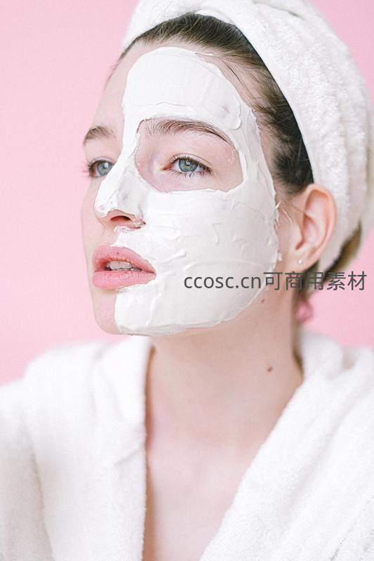 一位年轻女性头裹白色毛巾,脸上敷着厚厚的白色面膜,眼神宁静,展现日常护肤的舒适与惬意。