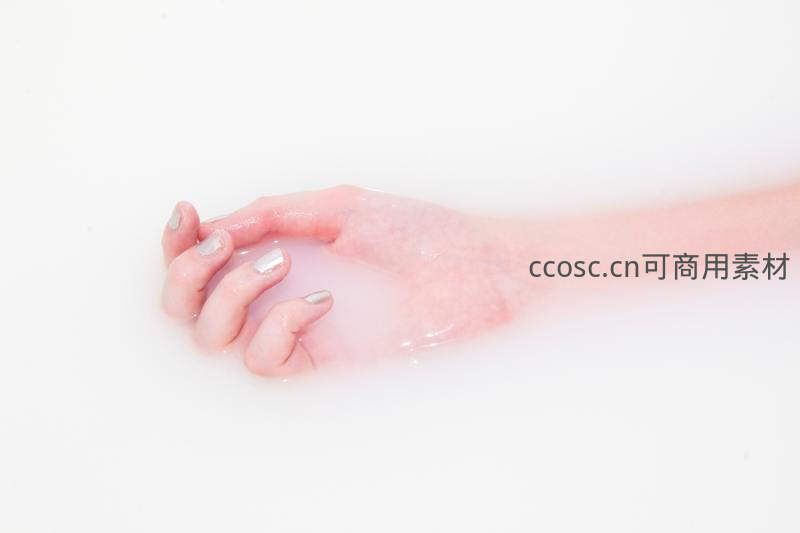 浸泡在乳白色液体中的手部特写,指甲闪耀银色光泽