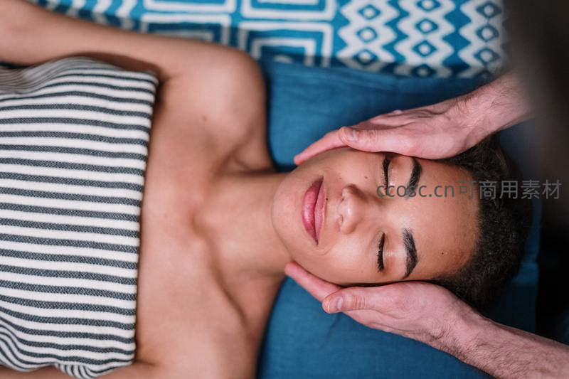 女性闭目享受专业头部按摩,双手轻柔托住脸颊,躺在蓝色枕头上,体验身心彻底放松的疗愈时光。