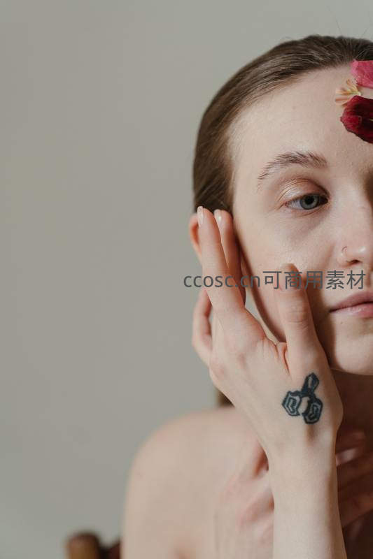 一位女性轻抚脸颊,额前点缀着干花,手背有独特纹身,画面温馨自然,展现个人风格与柔美气质。