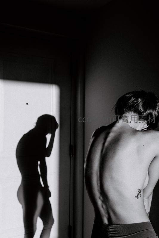 黑白画面中,人物背对镜头,镜中投射出孤独剪影,强烈的明暗对比与空间构图,传达内心深处的情感与哲思。