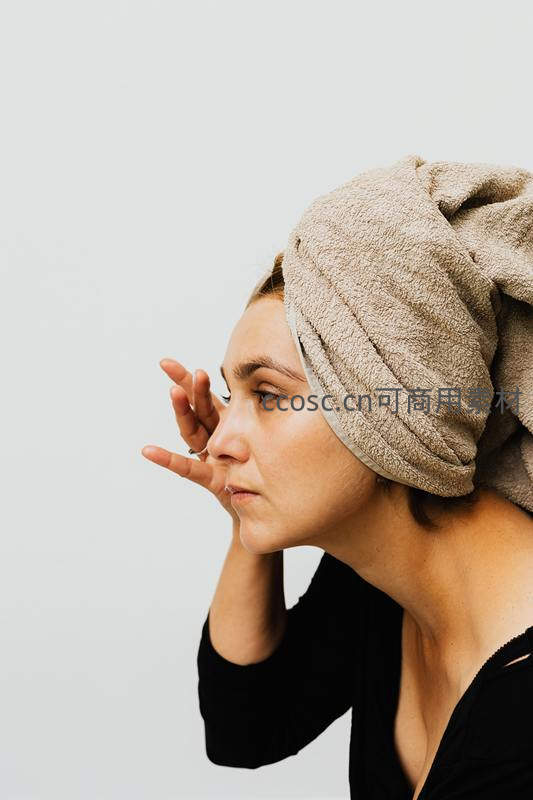 一位年轻女性用浅棕色毛巾包裹头发,身穿黑色上衣,在纯白背景下专注地进行面部护理,展现自然放松的居家护肤时刻。