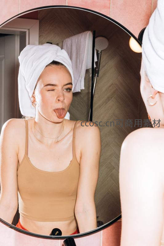一位裹着白色毛巾的年轻女子站在圆形镜前,对着镜子俏皮地眨眼睛并吐舌头,营造出轻松幽默的居家自拍氛围。