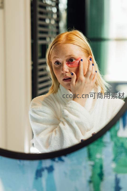 一位金发女子身穿白色浴袍,在圆形镜子前专注地贴着眼部护理贴片,蓝色指甲与粉色眼膜形成色彩对比,展现居家美容的宁静时刻。