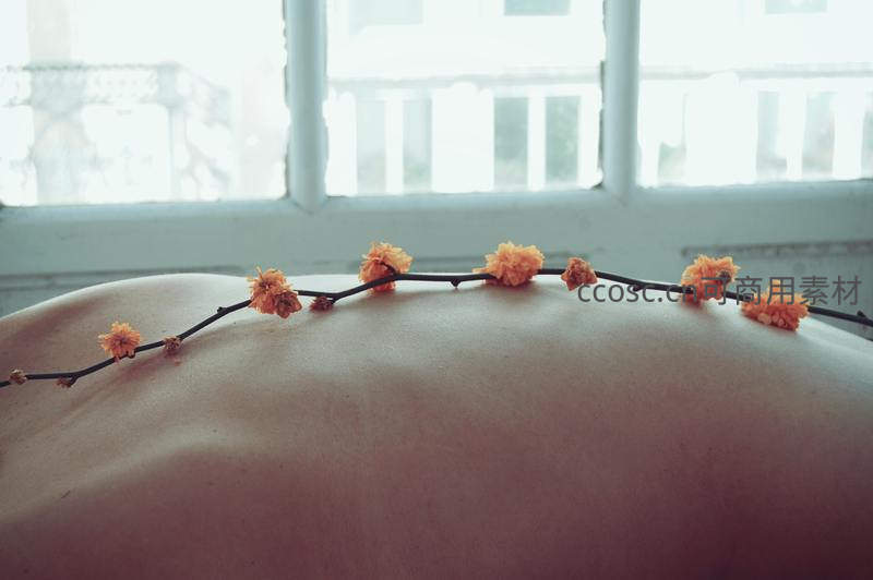 一枝橙色小花轻柔地横卧在光滑的背部肌肤上,背景是明亮的窗户,营造出宁静、诗意与自然融合的氛围。