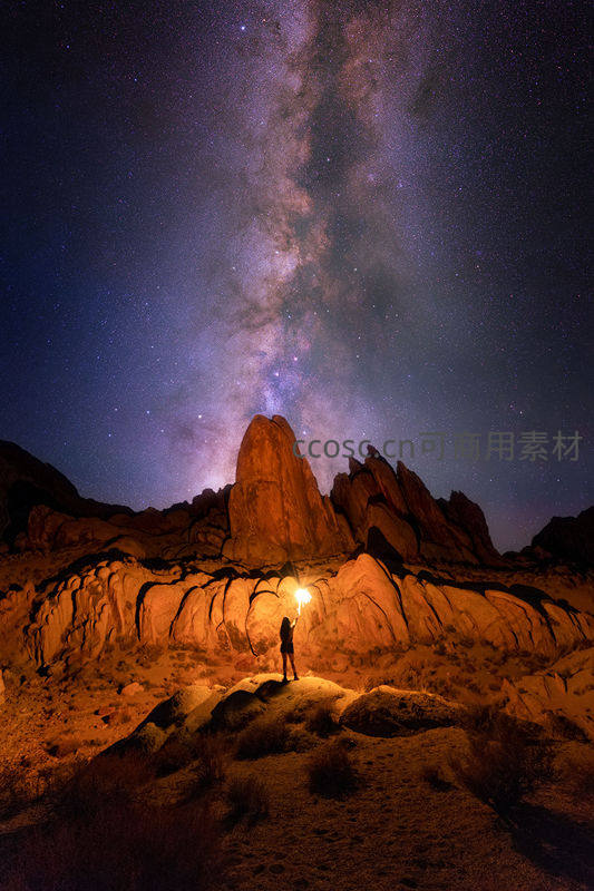 一人手持光源伫立于奇崛的岩石群中,仰望横跨天际的璀璨银河,渺小的人类与宏大的宇宙形成震撼对比,充满探索与敬畏之情。