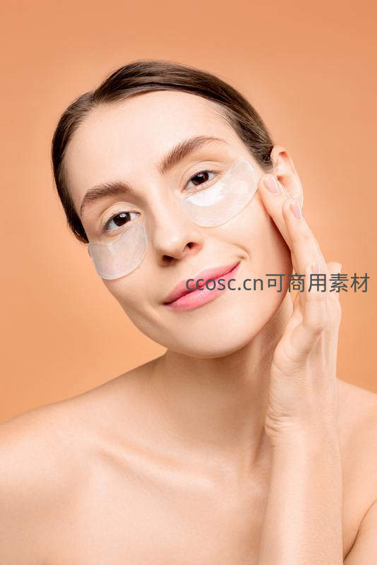 一位年轻女性正在使用透明眼膜贴敷于眼下,轻柔触碰脸颊,展现日常护肤的温柔时刻,背景为柔和暖色,突出肌肤质感与产品效果。