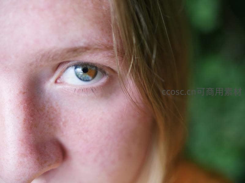 一位年轻女性的面部特写,突出其布满雀斑的肌肤和清澈的碧绿色眼睛,背景为模糊的绿色植物,营造出清新自然的氛围。