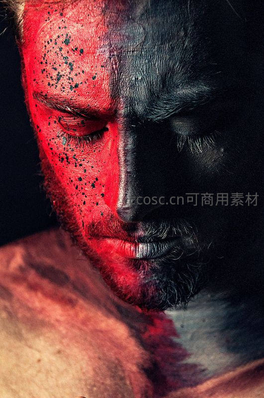 男子半张脸被炽热红光笼罩,另一半隐于黑暗,面部点缀黑色斑点,营造强烈视觉冲击力,传达深沉内省的情绪。