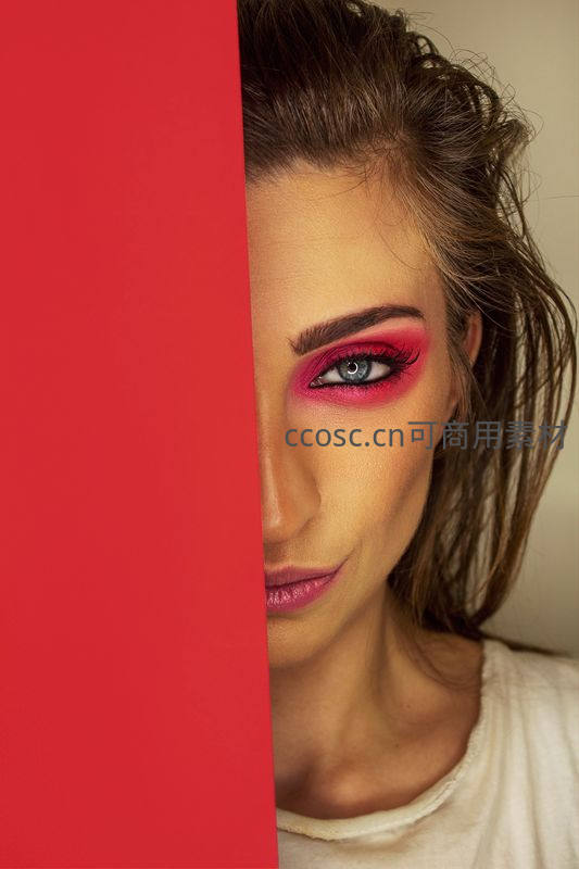 女性以红色面板半遮面,浓烈眼妆与浅色肌肤形成对比,散发现代时尚气息,展现个性与视觉冲击力的完美结合。