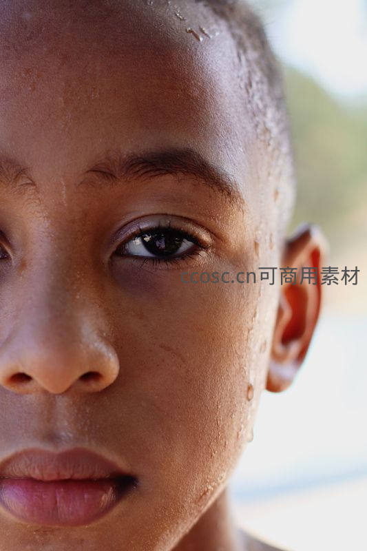 一个少年在户外活动后,脸上布满晶莹汗珠,眼神专注而清澈,展现出青春活力与纯真无邪的瞬间。