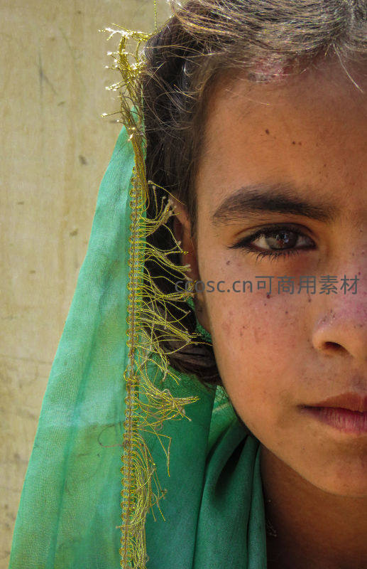 一位佩戴绿色饰边头巾的女孩,眼神平静而深邃,背景质朴,体现异域文化风情与孩童纯真宁静的内在世界。