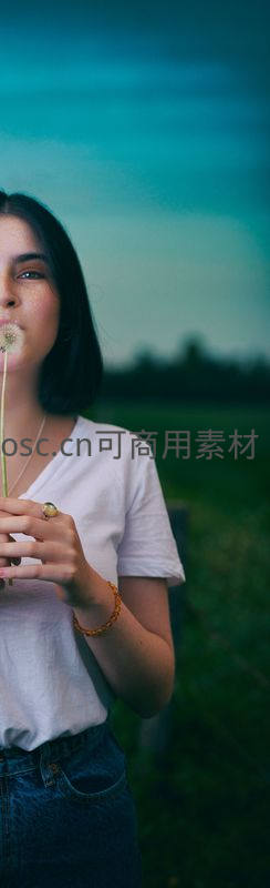 少女站在暮色田野中,轻轻吹散蒲公英种子,神情温柔恬静,背景朦胧绿意盎然,传递出无忧无虑的青春与自然之美。