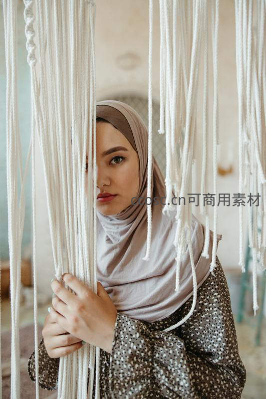 一位佩戴浅色头巾的女性轻握白色编织帘幕,目光柔和地望向镜头,背景朦胧温馨,营造出静谧优雅的氛围,体现现代与传统的融合之美。