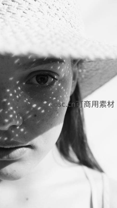 草帽光影下的少女黑白艺术肖像