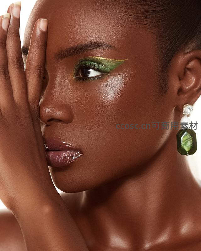 深色肌肤搭配亮眼绿色眼妆,佩戴独特宝石耳环,展现高级时尚感与精致妆容艺术。