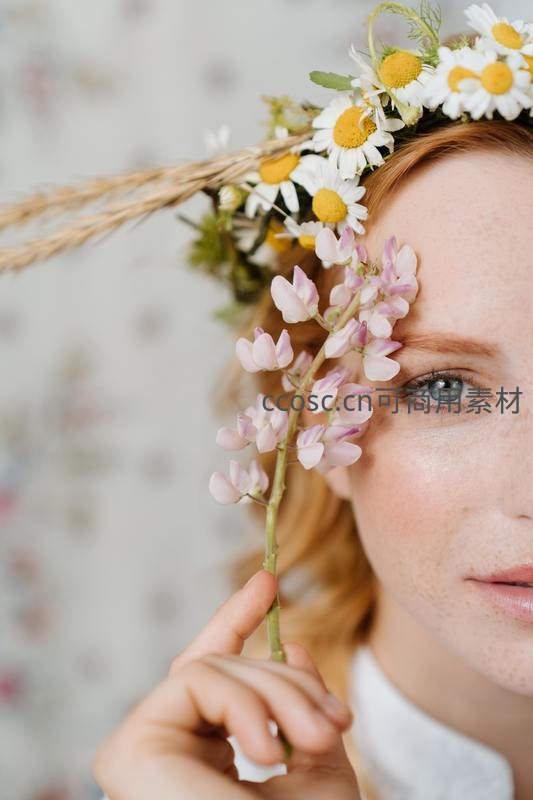 红发少女头戴雏菊与麦穗编织的花环,手持粉色花朵轻触面颊,雀斑与清澈蓝眸相映成趣,散发出复古而清新的田园气息。