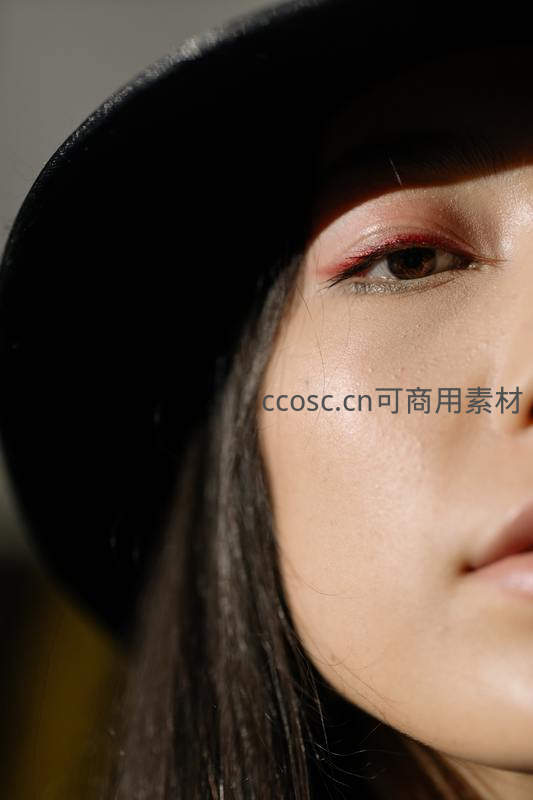 光影下的精致眼妆与黑色礼帽特写
