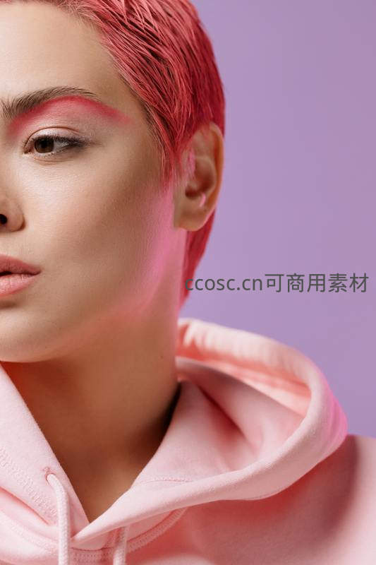 一位拥有亮粉色短发的年轻女性,身穿同色系连帽卫衣,搭配大胆的粉色眼妆,展现出鲜明的个性与前卫的街头潮流风格。