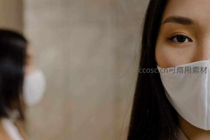 戴口罩女子镜前凝望自我