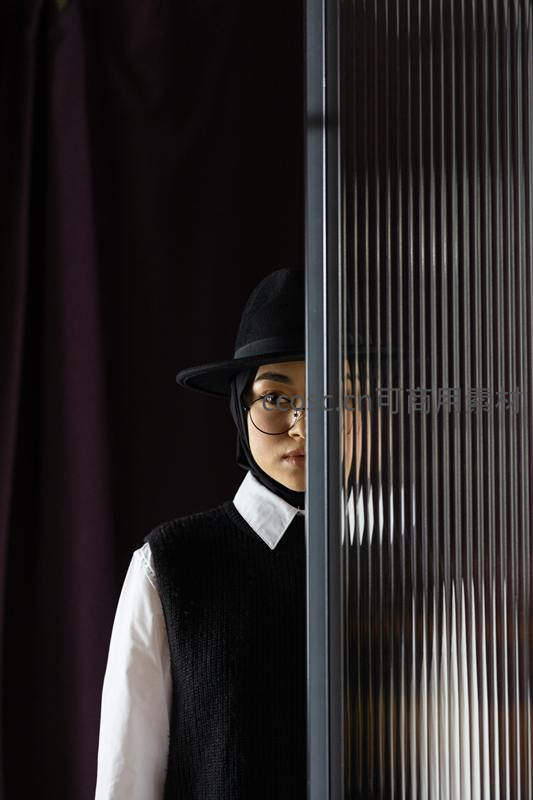 一位戴着黑色礼帽和眼镜的女性从竖条纹隔断后探出半张脸,神情若有所思,充满艺术感与神秘气息。