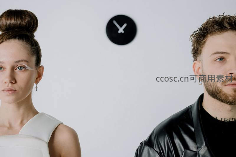 一男一女在纯白背景下对视,服饰与妆容充满设计感,营造前卫时尚氛围,表现当代青年的个性表达与视觉张力。