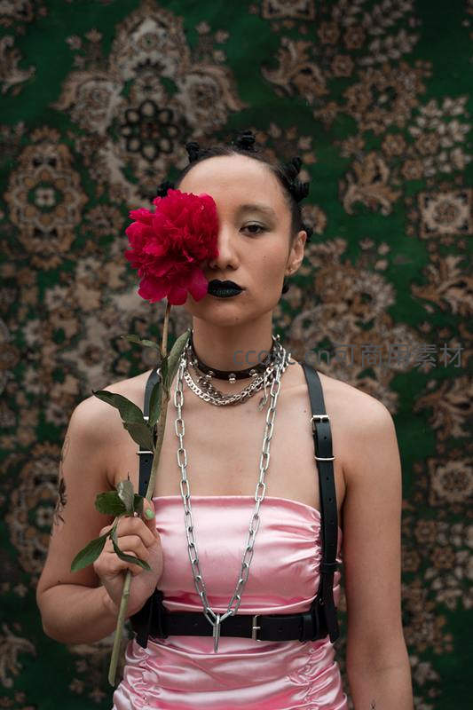 一位女性身着粉色缎面吊带裙,佩戴金属链条项链,手持一朵硕大的红牡丹遮住半边脸,背景是复古花纹地毯,整体风格前卫而优雅。