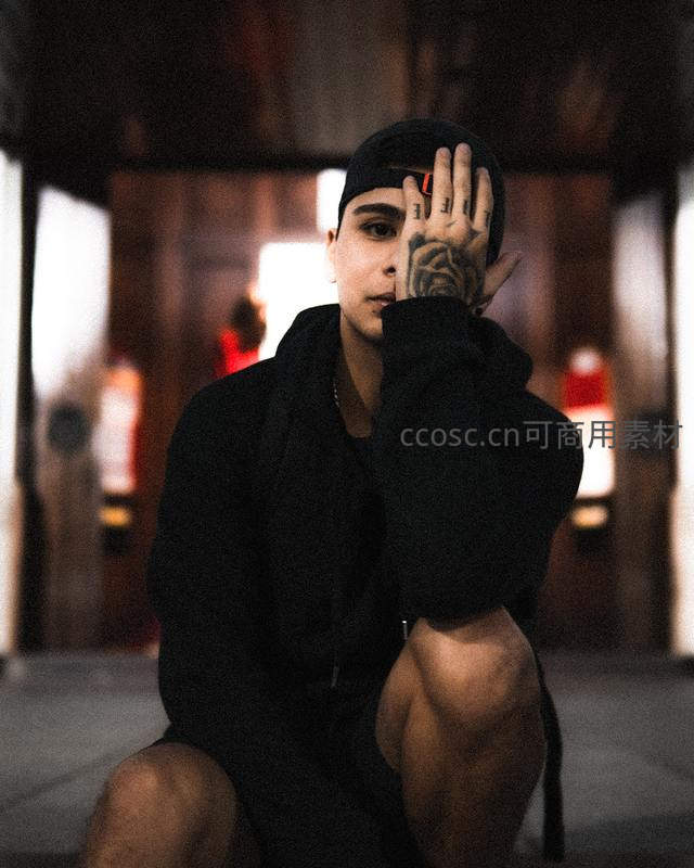 一位身穿全黑服装的年轻男性蹲在昏暗的巷道中,用带有纹身的手遮住半张脸,背景虚化灯光点缀,展现出强烈的街头潮流感。