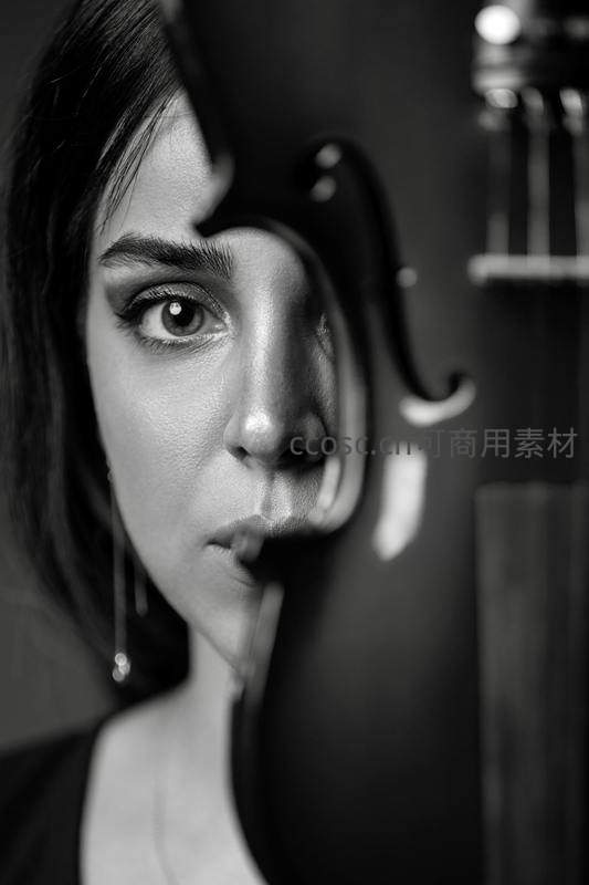 黑白影像中,一位女子将脸贴近小提琴,眼神专注地凝视镜头,琴身曲线与面部轮廓交融,传递出古典音乐的静谧与艺术之美。