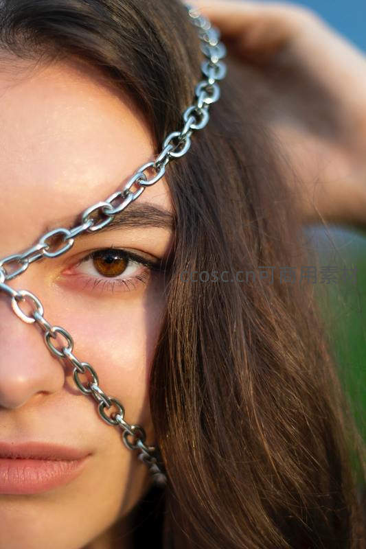 金属链条轻绕眉眼,自然光下的时尚特写