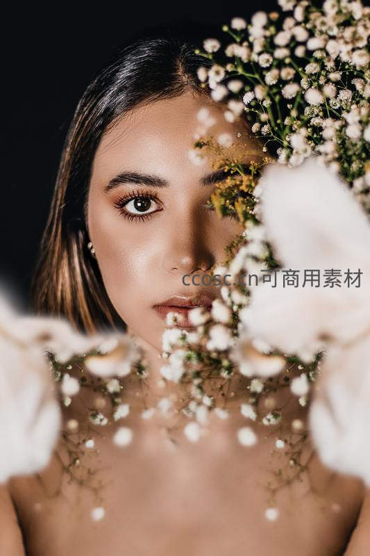 一位妆容精致的女子被满天星花束环绕,眼神清澈直视镜头,花瓣轻柔飘落,营造出浪漫而梦幻的视觉氛围。