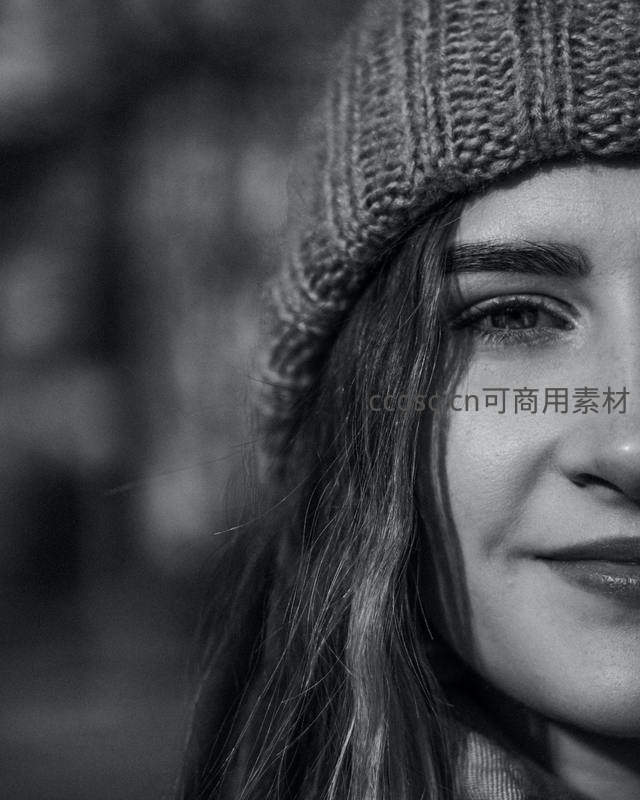 黑白影像中,戴针织帽的女孩侧脸微笑,光线柔和勾勒轮廓,传递出宁静、温暖与文艺气息,充满怀旧质感。