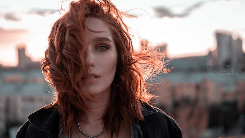 红发女子立于城市天际线前,夕阳余晖洒满发丝,微风吹拂发梢,黑色皮衣增添酷感,展现自由不羁的都市风情。