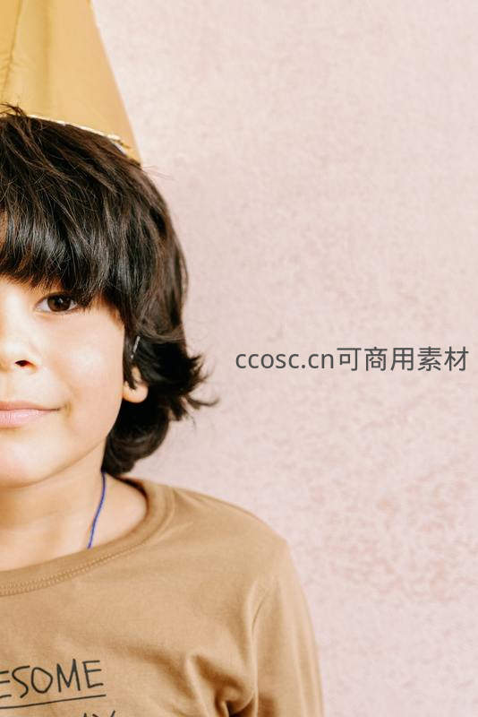 一个戴着金色生日帽的小男孩侧脸微笑,背景是柔和的粉色墙面,穿着印有文字的T恤,整个画面洋溢着童真与节日的温馨快乐气氛。